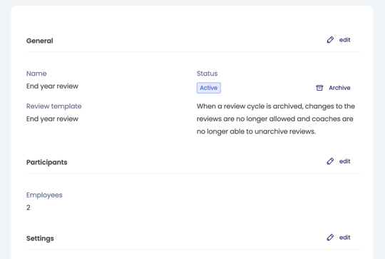 Bij stap 3: Instellingen. Je kunt besluiten dat je niet wilt dat de ronde automatisch na 30 dagen wordt gearchiveerd. Verder kun je nog een wijziging doorvoeren in de automatische notificaties en in de privacy instelling. Ook vorige scores kun je nog (de)activeren zolang de status van de review aankomend of actief is.