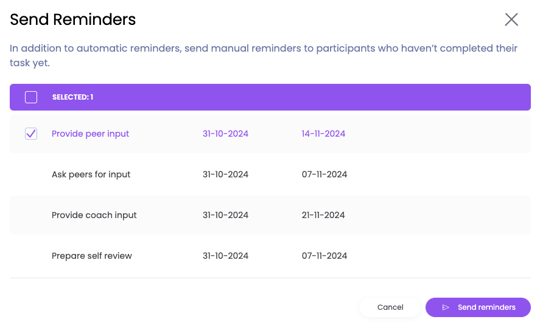 Om het afrondingspercentage van bepaalde taken of acties verder te verhogen kun je als Admin of als aanmaken van de evaluatiecyclus ook reminders versturen naar diegenen die een taak nog niet hebben afgerond. Dit kan je optioneel doen als aanvulling op de automatische notificaties die Learned stuurt.