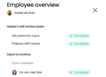 Wil je meer informatie over een bepaalde medewerker binnen de evaluatieronde? Klik dan op desbetreffende medewerker. Een overzicht van deze medewerker opent in een pop-up. Je ziet hier of de medewerker zijn evaluatie al heeft voorbereid, peers heeft gevraagd voor feedback. En of de coach en peers al feedback hebben gegeven.