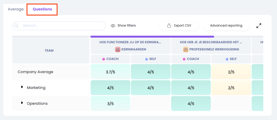 Onder de tab 'Vragen' zie je alle vragen die in de evaluatie zijn uitgevraagd terug met bijbehorende score. Daarnaast zie je ook bij welk thema deze vraag hoort. Wanneer je op 'Toon filters' klikt, heb je de mogelijkheid om te filteren op een bepaald thema. Kies je voor de competenties, dan zul je ook een gemiddelde score van de verschillende competenties kunnen zien.