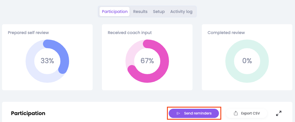 Wanneer je handmatige reminders wilt versturen, ga je hiervoor naar het Evaluatiecyclus dashboard. Scroll naar beneden naar Participatie en druk op de knop 'Herinneringen verzenden'. Een pop-up venster verschijnt waar je de taak kunt selecteren die je handmatig wilt versturen. De herinnering wordt alleen verstuurd naar degenen die de taak nog niet hebben afgerond.