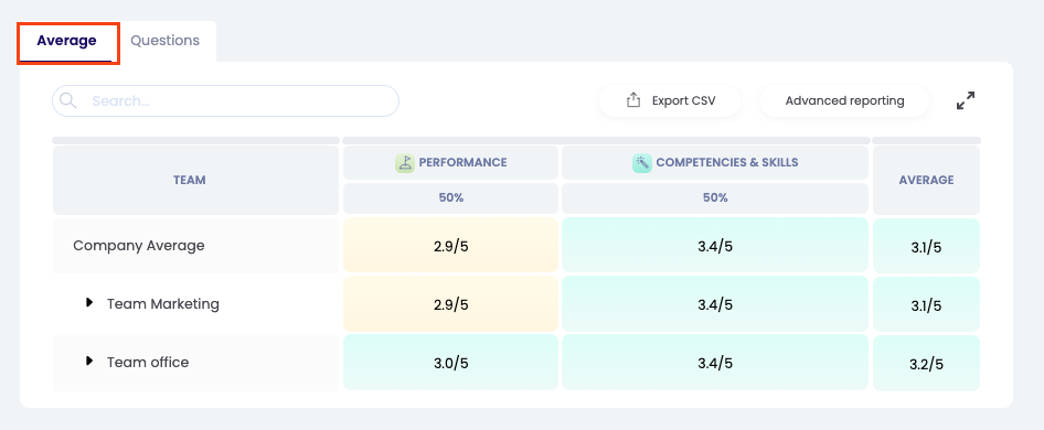 In de tabel zie je de gemiddelde scores van het bedrijf, per team en per medewerker op de verschillende uitgevraagde thema's onder de tab 'Gemiddelde'.