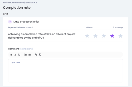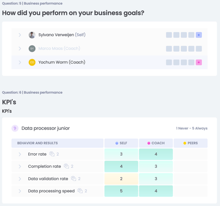 Zo zijn er vragen waarbij je een score moet geven, voor bijvoorbeeld een evaluatie op de skills of KPI's vanuit jouw functieprofiel of op de kernwaarden van het bedrijf. Ook kunnen er open vragen in het formulier zitten, of vragen om doelen te plannen.