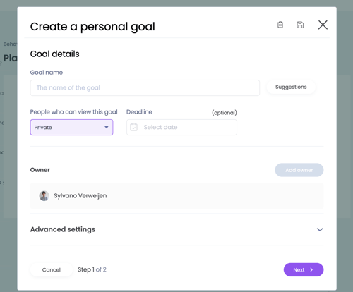 Hier kan je direct een doel opstellen aan de hand van 2 stappen. Alle aangemaakte doelen zijn terug te vinden in de doelen module van Learned.