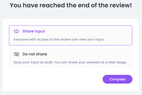 Wanneer je klaar bent, zie je in het eindscherm de mogelijkheid om de input van jouw zelfevaluatie te delen. Wanneer je kiest voor deel input, zal jouw input worden gedeeld in het evaluatieverslag en kunnen jouw coaches, eventuele gasten en Admins jouw input zien.