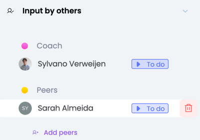 Je vindt de gevraagde collega's terug onder de sectie 'Input van anderen' waar je hier mogelijk nog wijzigingen in aan zou kunnen brengen. Je kunt collega's niet meer verwijderen wanneer zij eenmaal zijn begonnen met het schrijven van input.
