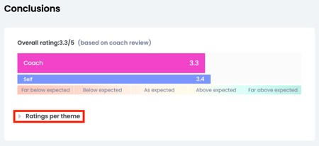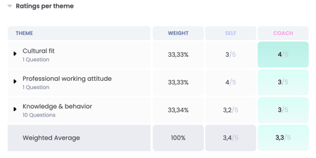Klik op 'Scores per thema' om te bekijken hoe deze gemiddelde score is opgebouwd. Zo kan de weging per thema bijvoorbeeld verschillen. Ook kan je jouw scores per thema vergelijken met wat jouw coach heeft ingevuld, of eventueel jouw collega's.