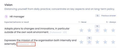 Als 'Vorige antwoorden' is geactiveerd door de Admin, zie je ook je vorige antwoorden terug in je rapport. Dit is een snelle indicator om te zien of je score gelijk is gebleven ten opzichte van een vorige evaluatie, is toegenomen of afgenomen.