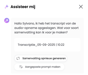 π‘: Je hebt de mogelijkheid om 'Assisteer mij' te gebruiken bij de samenvatting van de opname. Zo kun je de samenvatting opnieuw laten genereren of een aangepaste prompt maken.