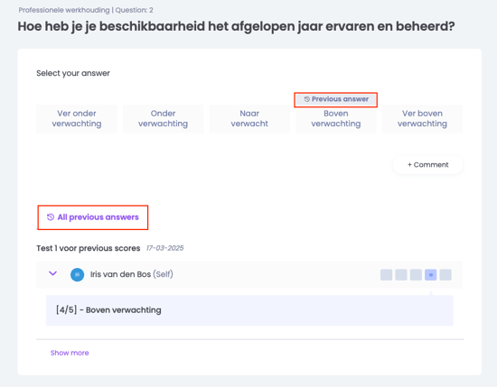 Wanneer de Admin heeft aangezet bij het aanmaken van de cyclus dat je jouw vorige scores kan inzien op de vragen die je in het vorige gesprek hebt beantwoord, zie je dit terug aan de hand van een label 'Vorige antwoord'. Onder de vraag vind je ook alle vorige antwoorden op deze vraag uit verschillende evaluaties terug, zowel van de zelf-evaluatie, als van de coach en peer evaluatie. Dit helpt jou in je voorbereiding op de vragen en hoef je niet eerst het oude rapport erbij te zoeken.