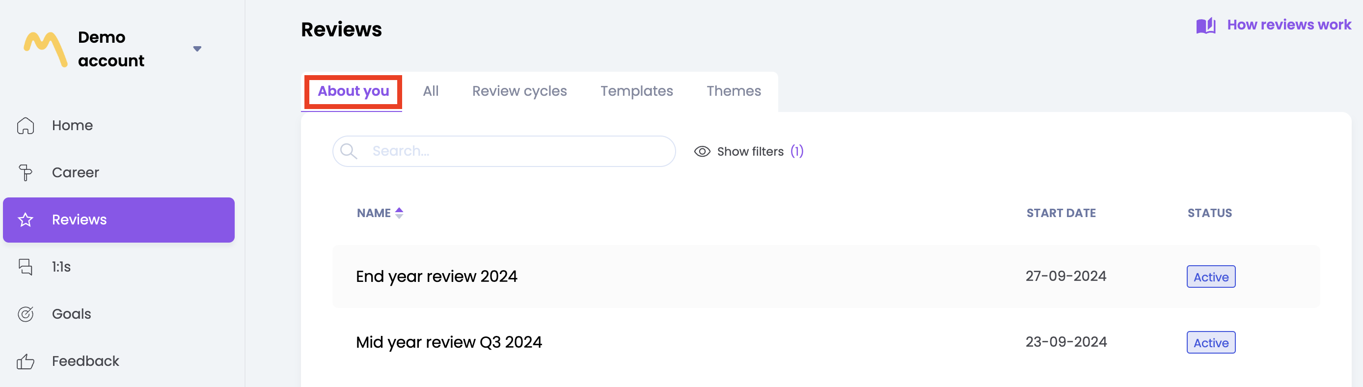 Al jouw evaluaties zijn terug te vinden op de pagina 'Evaluaties' onder de tab 'Over jou'. Op deze pagina vind je alle verslagen die over jou als medewerker gaan. Je kunt filteren op naam, datum en status. Als je een verslag wilt bekijken, klik je op een van de evaluaties in de lijst en het evaluatierapport wordt direct geopend.