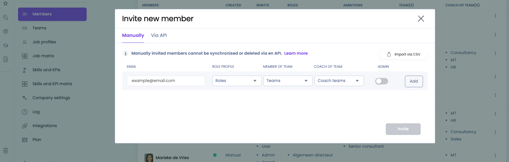 💡: De bovenstaande opties zijn ook na het uitnodigen van de medewerker beschikbaar in het profiel van de medewerker.