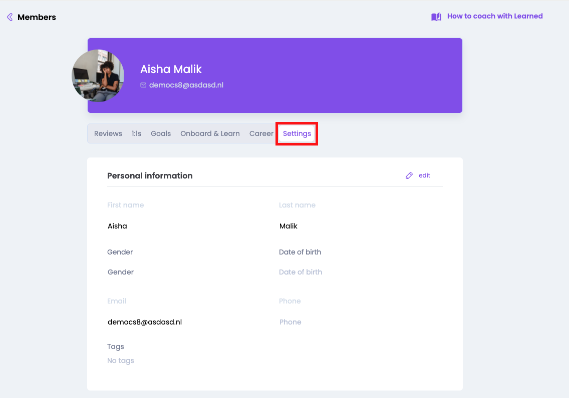 Meer opties voor het beheren van de medewerkers vind je op de instellingen pagina van de medewerker. Klik op de ledenpagina op de medewerker die je wilt beheren. Klik in zijn profiel op de 'Instellingen' pagina.