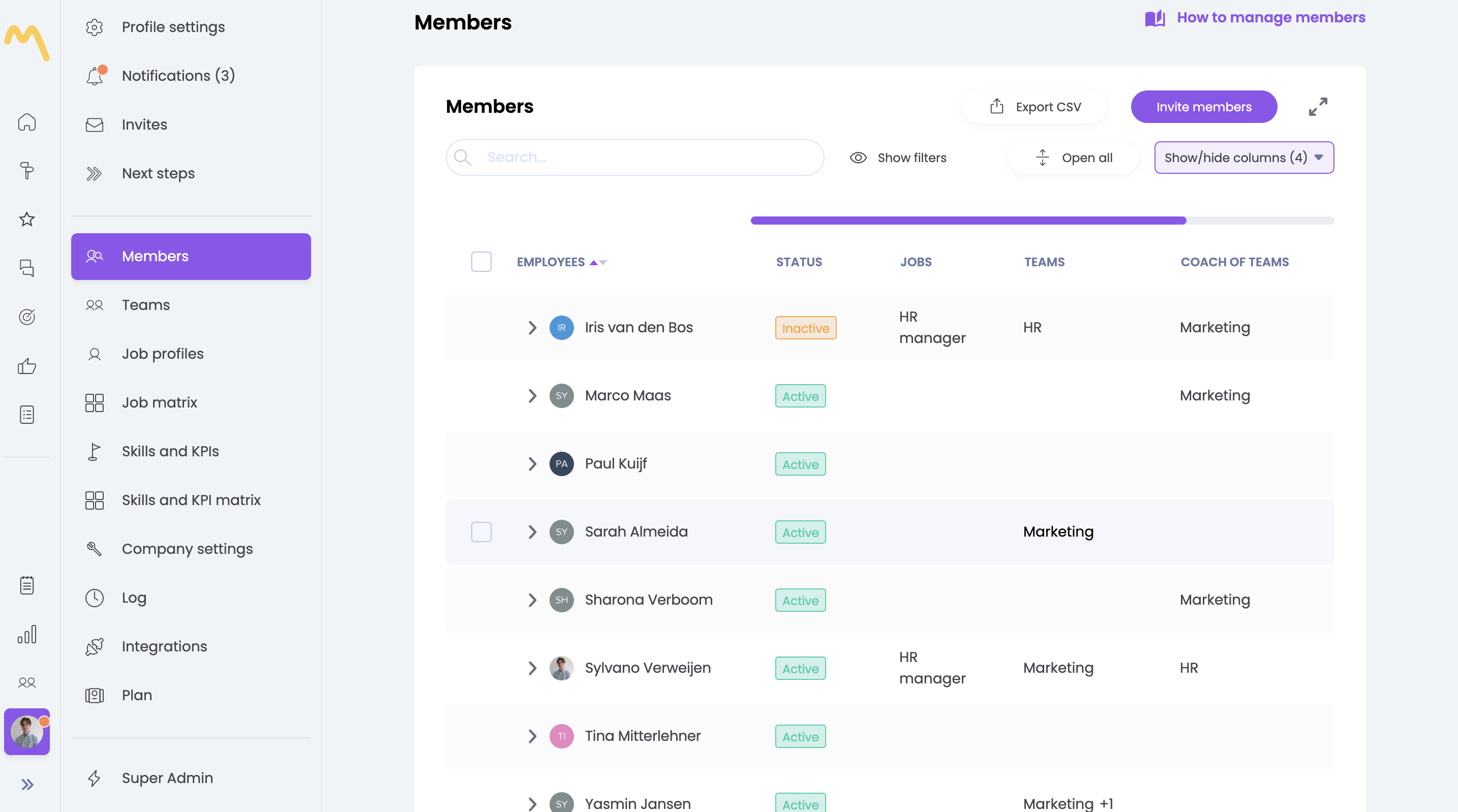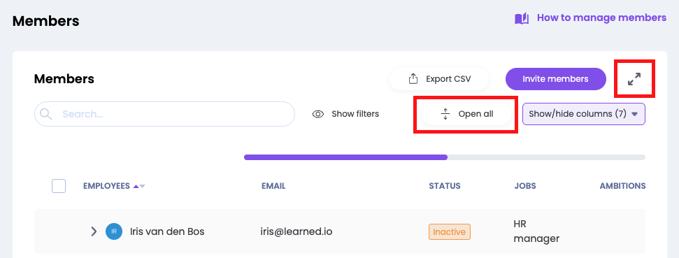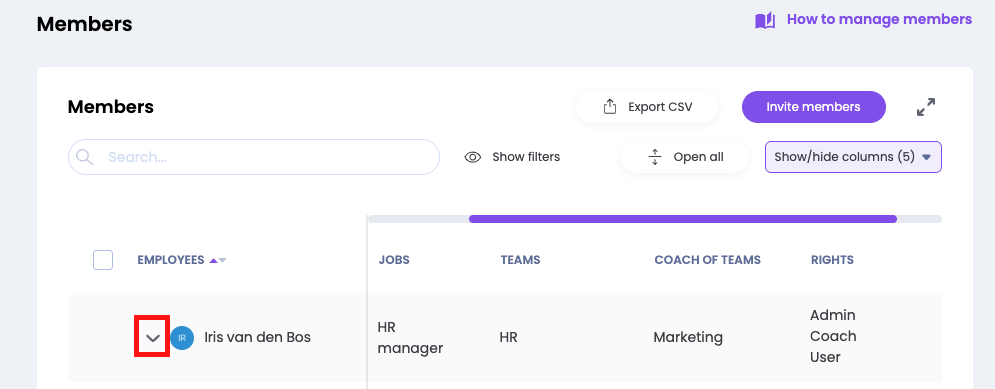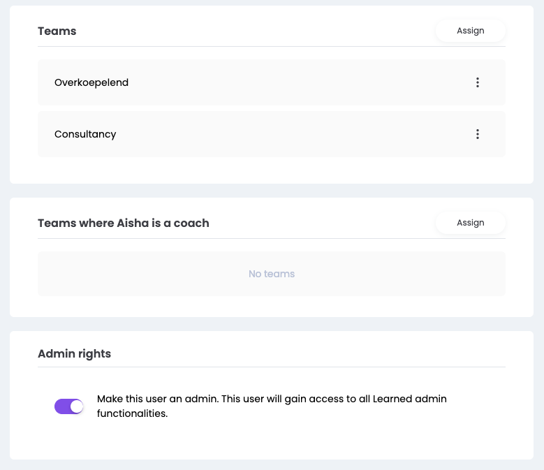 Binnen Learned heb je als Admin een overzichtspagina met alle leden in het Learned account. Op deze pagina zie je niet alleen de namen van de medewerkers, maar ook welke rechten zij in het platform hebben, welke rol zij vervullend, of ze eventueel een ambitierol hebben aangevinkt, in welk team ze zitten en of ze ook coach zijn van een bepaald team.