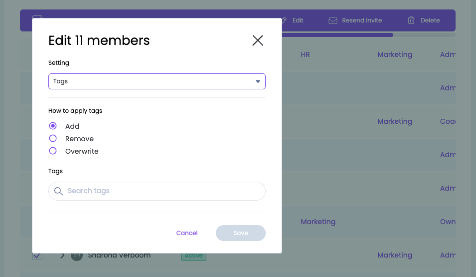 Selecteer eenvoudig meerdere leden en pas in één handeling hun tags aan via edit. Dit is handig voor het categoriseren of opnieuw indelen van leden.