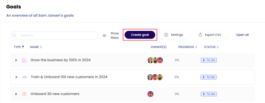 Als coach kan je een persoonlijk doel aanmaken voor een medewerker. Ga via Team naar de desbetreffende medewerker. Op de Doelen overzichtspagina van de medewerker kan je op de knop 'Doel aanmaken' klikken. Je kunt vervolgens het doel opstellen.
