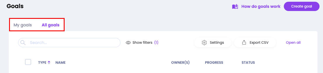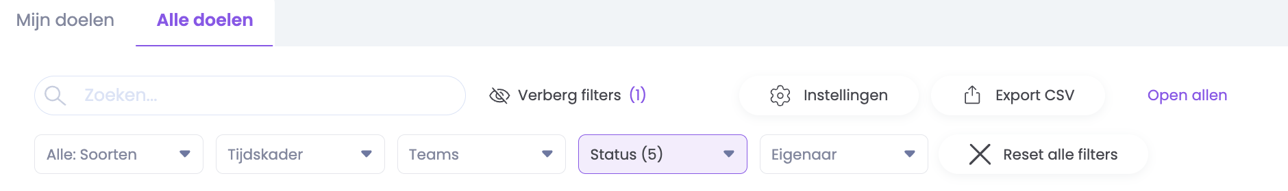 Als manager van jouw team is de 'Alle doelen-pagina' een overzichtspagina van alle doelen van jouw teamleden waar ze aan werken. Aan de hand van de filteropties kun je gemakkelijk filteren op type doel, team, eigenaar, status of tijdskader. Daarnaast kun je hier ook andere doelen zien waar jij rechten voor hebt om die te mogen zien, bijvoorbeeld organisatiedoelstellingen. Zo ben jij op de hoogte wat de status is van de organisatiedoelen en kun je jouw teamdoelen daar op aanpassen, of jouw team hierin meenemen.