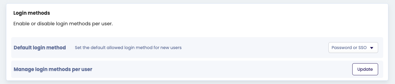 Verder kun je op de pagina Bedrijfsinstellingen standaard login methodes met SSO instellen. Een standaard login methode houdt in dat je medewerkers verplicht stelt om te registreren én in te loggen met die SSO functionaliteit. Je hebt hierbij dus keuze Google SSO en Azure AD SSO.