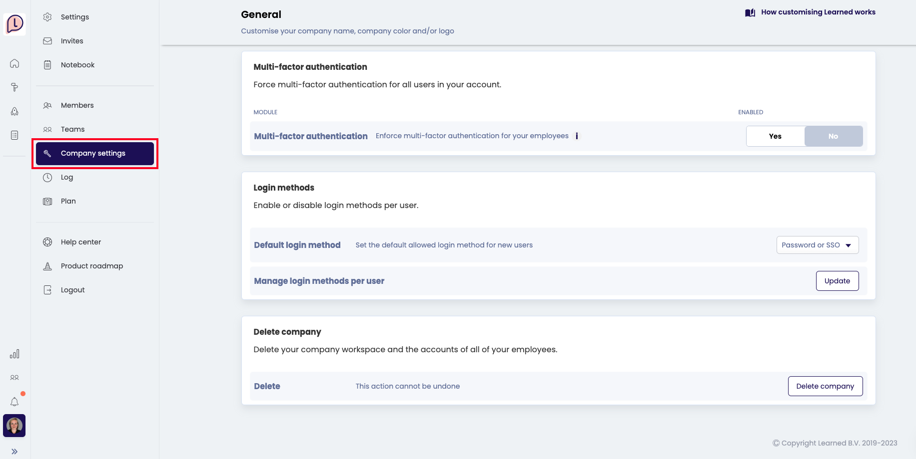 Bij Learned nemen we de veiligheid van je gegevens en de wijze van inloggen zeer serieus. Als Admin kun je via jouw profielfoto linksonder naar de bedrijfsinstellingen gaan. Hier kun je bepaalde instellingen hiervoor beheren.