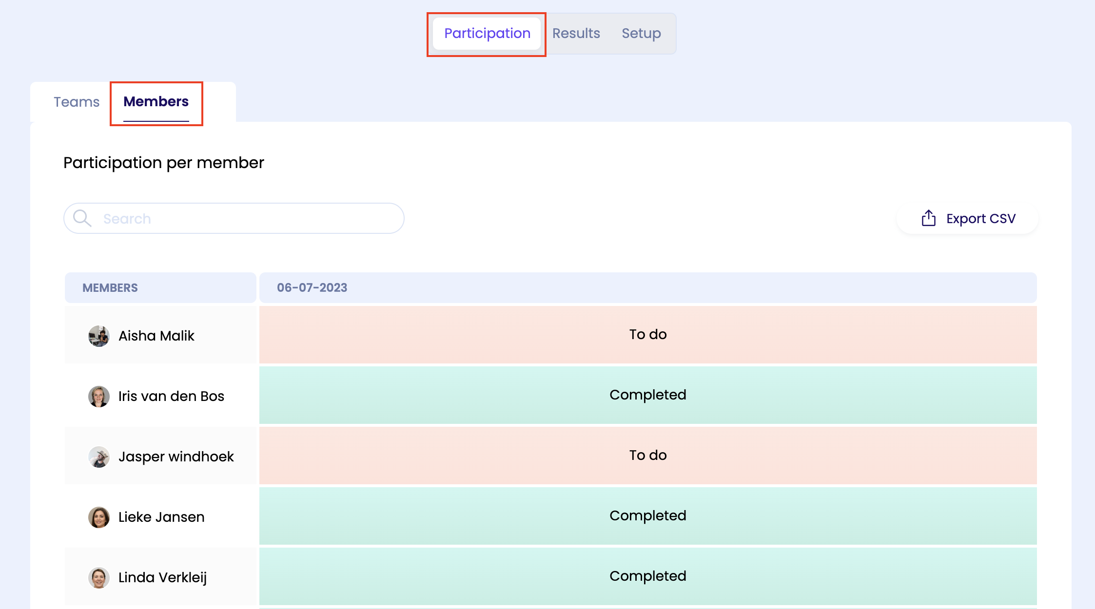Wanneer je anonimiteit uit zet, zie je als Admin zijnde een lijst met alle deelnemers. Vanuit die lijst kan de Admin zien wie de survey al heeft ingevuld en wie nog niet. De Admin kan niet per medewerker zien welke antwoorden zijn gegeven. Echter wanneer je slechts 1 persoon in bijvoorbeeld team HR hebt zitten en anonimiteit staat uit, kun je wel de resultaten van team HR zien, en kun je in dit geval de antwoorden van een specifieke medewerker achterhalen.