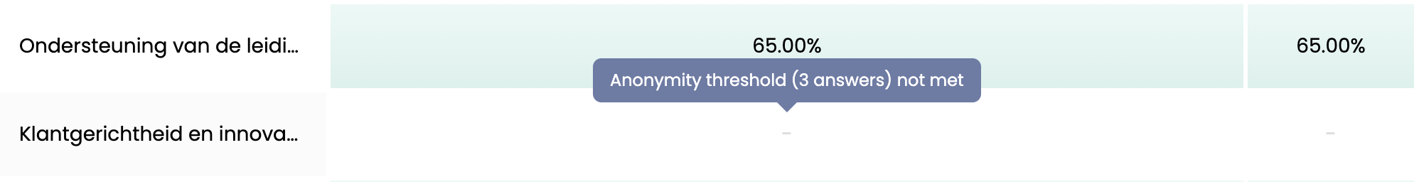 Elke survey is standaard anoniem, tenzij de Admin anders heeft aangegeven bij het aanmaken van de survey. Wanneer anonimiteit aan staat, bepaalt de Admin vervolgens ook hoeveel antwoorden er gegeven moeten worden voordat de gemiddelde scores op de thema's zichtbaar worden in de rapportage. Als de rapportage grens niet is behaald, zie je dit ook terug in de rapportage wanneer je over de resultaten heen gaat met je cursor: