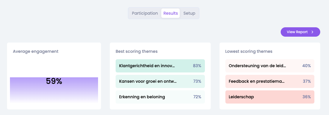 Zowel een traditionele als een pulse survey krijgen een beknopte rapportage met o.a. de 3 best scorende en 3 laagst scorende thema's. Met het uitsturen van surveys in de organisatie, verschijnen er namelijk verschillende scores op team of thema niveau. Deze scores vormen de basis om vervolgens als organisatie inzicht te krijgen in de thema's waar mogelijk verbeteringen kunnen worden doorgevoerd om medewerkers-betrokkenheid te vergroten binnen de organisatie. In het Betrokkenheid-rapport kun je veel dieper op de data ingaan en een uitgebreide analyse maken.