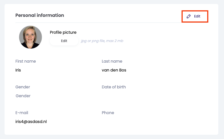 Op jouw persoonlijke profiel kun jij verschillende gegevens instellen of wijzigen. Zo stel je onder Persoonlijke informatie jouw naam, geslacht, telefoonnummer en geboortedatum in. Klik op 'Bewerk' om jouw gegevens aan te passen.