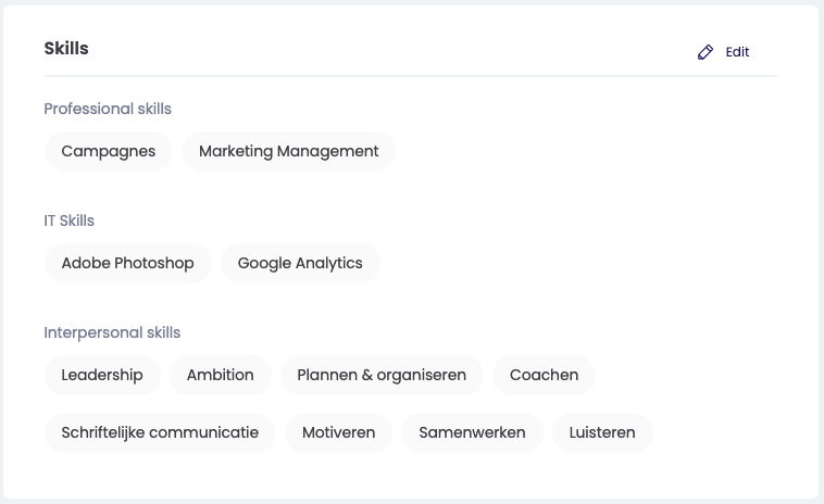 Onder skills zie jij de skills terug die gekoppeld zijn aan jouw huidige rol. Via de Bewerk-knop heb jij de mogelijkheid om bepaalde skills te verbergen, of juist anders skills toe te voegen waarvan jij vindt dat je deze ook bezit.