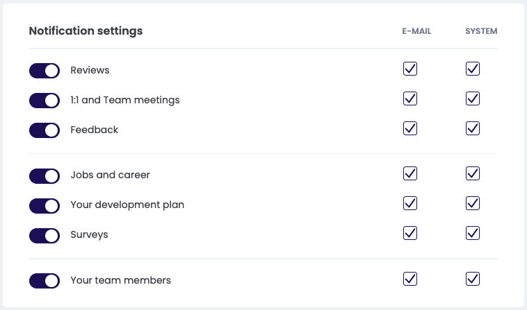 In de sectie over notificaties kun jij zelf bepalen waar je precies notificaties van wilt ontvangen. Daarnaast heb je nog de mogelijkheid om te bepalen of je daar dan een e-mailnotificatie van wilt ontvangen, of alleen een systeemnotificatie.
