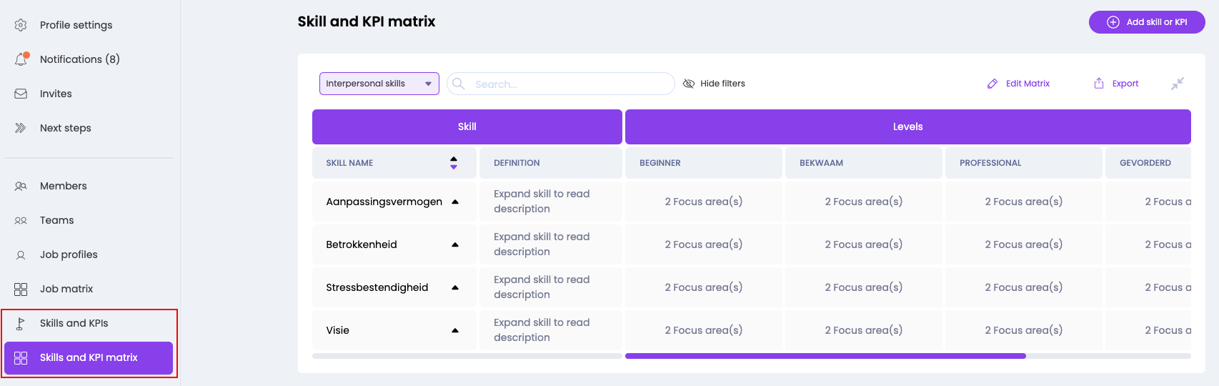 Om je skills te bekijken ga je naar je profielfoto (linksonder in het menu) - Skills en KPI's (dit is een lijstweergave) of Skill en KPI matrix. Wanneer je naar Skill en KPI matrix gaat, heb je de mogelijkheid om jouw toegevoegde skills te bekijken in een skill matrix.