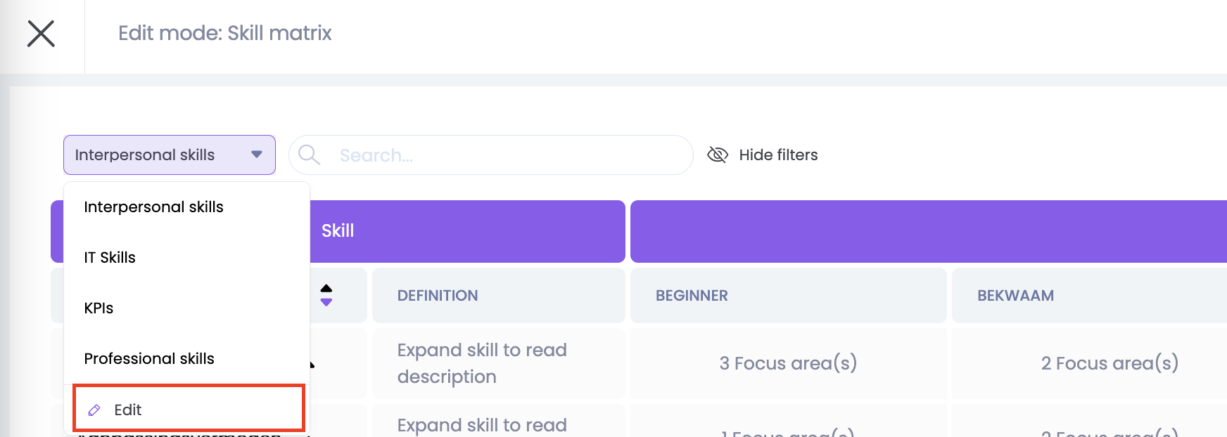 Als je de benaming van de skill categorie wilt aanpassen, of een nieuwe skill categorie wilt toevoegen, moet je in de Bewerk modus zitten van de skill matrix. Klik vervolgens op de dropdown van de skill categorieën en klik op Bewerk. Je hebt hier de mogelijkheid om de bestaande categorieën te hernoemen of een nieuwe categorie toe te voegen.