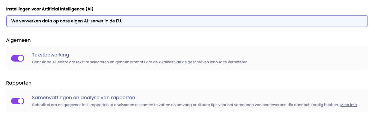 In de sectie 'Instellingen voor AI' kun je als Admin verschillende instellingen activeren of de-activeren.
