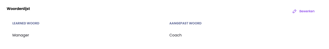 Bij de woordenlijst kun jij als Admin verschillende woorden vanuit het Learned platform vervangen voor een aangepast woord. Bijvoorbeeld manager vervangen voor leidinggevende.