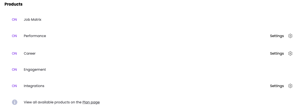 De 'Producten' sectie geeft aan welke producten er bij jullie in het account zijn geactiveerd. Zijn er producten nog niet geactiveerd, dan kun je voor dat product via de Plan-pagina een gratis proefperiode aanvragen.